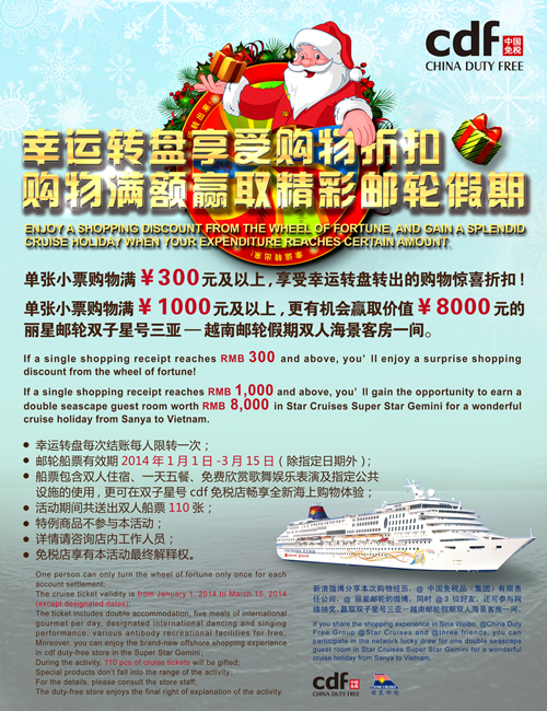 圣誕元旦臨近,旅游價(jià)格相對(duì)平穩(wěn)、上班族集中休假等因素使得今年雙節(jié)旅游市場再次迎來出游小高峰。其中不少公司白領(lǐng)將春節(jié)出境游計(jì)劃提前,選擇性價(jià)比更高的錯(cuò)峰出游。各大商家的年終促銷活動(dòng)讓節(jié)日提前升溫,2013年12月15日-2014年1月5日期間,中國免稅品(集團(tuán))有限責(zé)任公司(以下簡稱中免集團(tuán))旗下十家免稅店聯(lián)合推出“幸運(yùn)轉(zhuǎn)出來&幸運(yùn)秀出來”年終主題促銷活動(dòng),貼心的購物折扣以及價(jià)值約百萬元的麗星郵輪船票大獎(jiǎng),為雙節(jié)出境游客送上別樣驚喜。