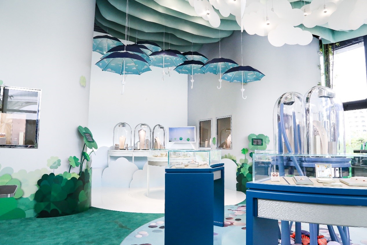 Van Cleef & Arpels梵克雅寶“Alhambra幸運花園”免稅限時精品店位于三亞國際免稅城后廣場。世家要員雅克·雅寶Jacques Arpels常言道:“心懷幸運之愿,方能成為幸運之士?!毙疫\是梵克雅寶一直以來十分珍視的價值,更是其創(chuàng)意靈感的泉源之一,因此限時精品店內(nèi)部設計以世家標志性四葉幸運圖案為主題,以延續(xù)這珍貴價值。進店后,首先映入訪客眼簾的將是Burcu & Geoffrey 這對法國和土耳其的導演拍檔為Alhambra 特別創(chuàng)作的四葉圖騰造型蝴蝶沿途散播幸運的種子,帶領(lǐng)游客穿梭在幸運花園中,引領(lǐng)大眾一同探索夢幻迷人的Alhambra 幸運花園, 為游客營造出一種舒適愉快的珠寶欣賞空間。