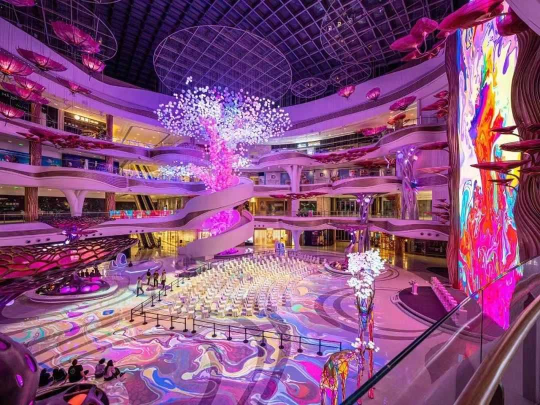 ▲??趪?guó)際免稅城項(xiàng)目“AURA天際秘林”中庭(攝于調(diào)試階段)